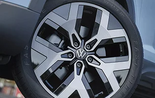 A roda de 19” do Novo Taos eleva a presença do SUV com um design que une robustez e refinamento. O acabamento diamantado, aliado às linhas marcantes, cria um efeito visual moderno e imponente — valorizando o perfil do veículo, esteja ele em movimento ou em destaque na rua.