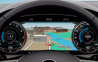 A tecnologia Active Info Display substitui o painel de instrumentos analógico por uma tela digital de 12,3" programável que exibe gráficos em 2D ou 3D. Agora você pode personalizar o painel com informações adicionais que auxiliam no seu trajeto.