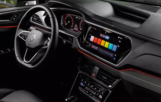 Troque a música sem tirar as mãos do volante, acompanhe o desempenho do veículo no painel digital e configure a temperatura do ar-condicionado ou dos bancos pelo VW Play do Taos em poucos cliques. Ah, e se você quiser ir além, também é possível mudar as cores da iluminação interna.
